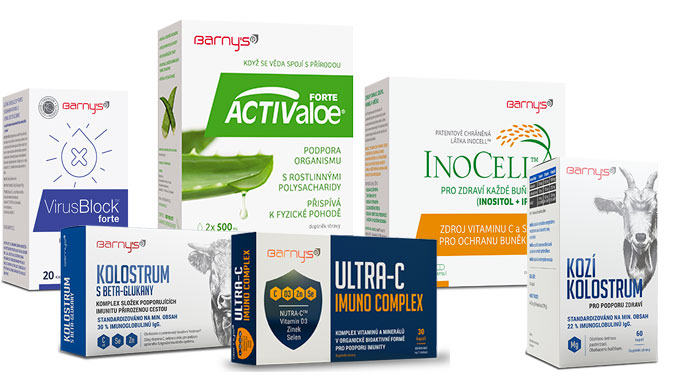 Doplňky stravy obsahující vitamin C, selen, zinek a aloe vera pro podporu správné funkce imunitního systému.